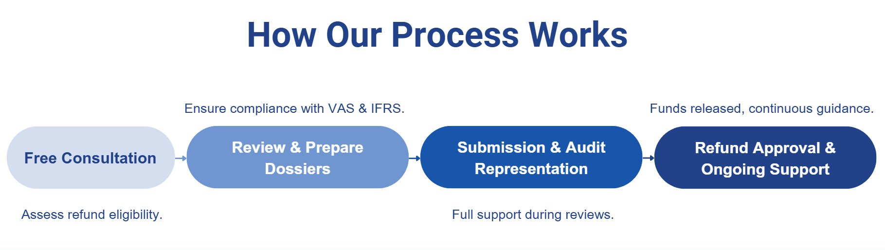 Full support during tax authority audits, including explaining accounting books and invoices, and monitoring to expedite refund approvals. Minimize stress while ensuring penalty-free compliance.